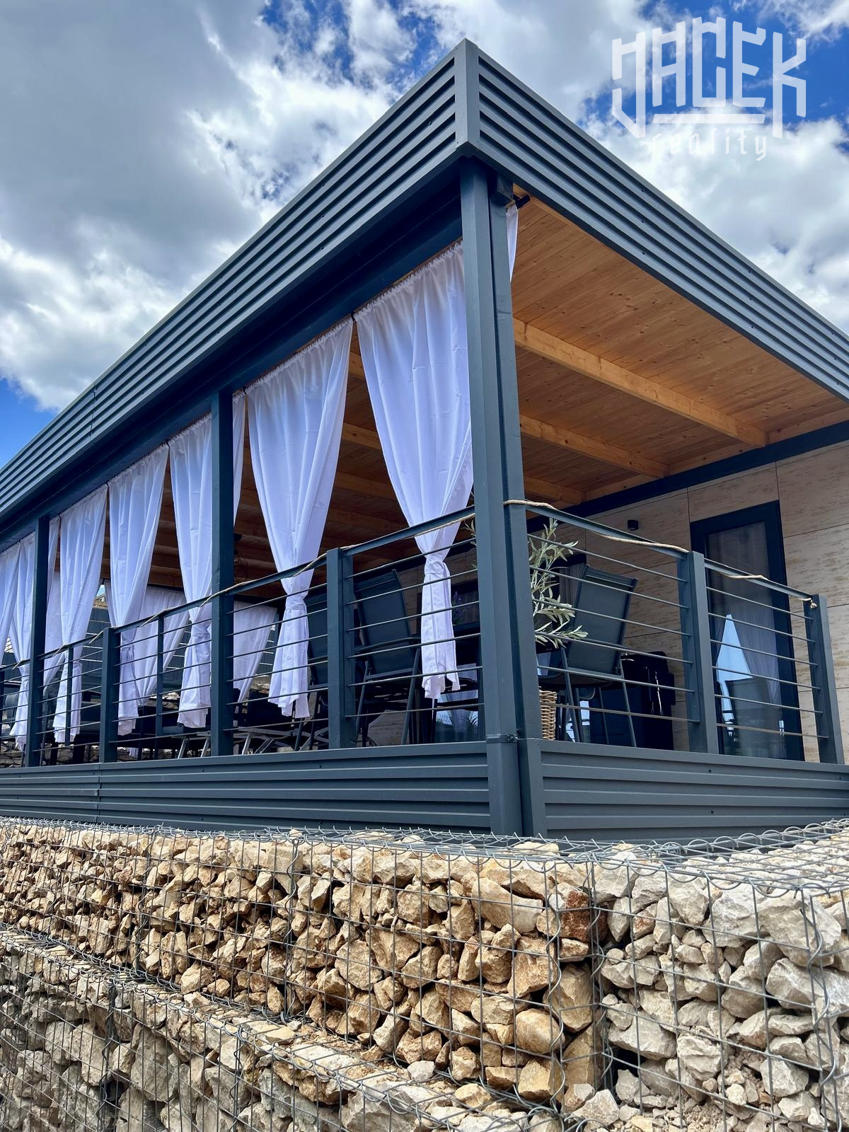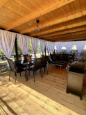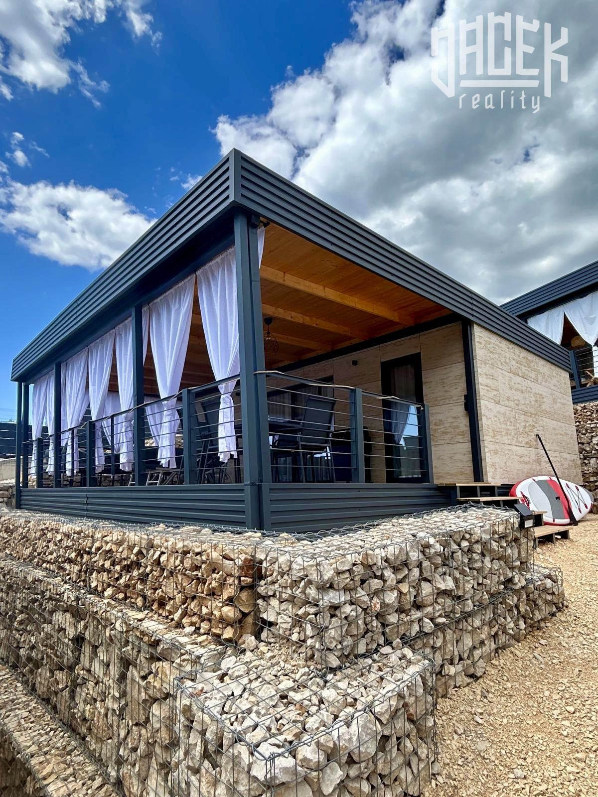 Dominantou každej nehnuteľnosti je krytá drevená terasa o výmere 36 m², ideálna na spoločné večere, oddych v tieni alebo rannú kávu. K dispozícii je aj vonkajšia solárna sprcha s vlastným priestorom, ktorá ponúka dokonalé osvieženie po dni strávenom pri mori.